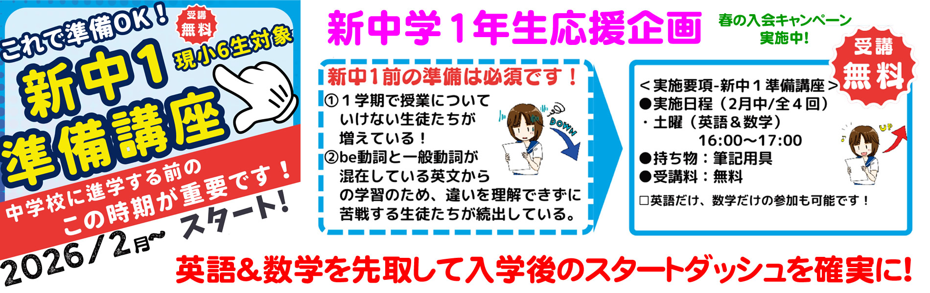 新着情報 ~アークからのお知らせ~ 新中1準備講座(小学6年生対象)【全校】2月より現小6対象の中学準備講座を実施致します。 内容は中学校で勉強する数学と英語になります。曜日、時間は各校で異なりますので下の問合せフォームよりお問合せください。 春の新規入会キャンペーン実施中!2026年度、『新年度入会キャンペーン』を実施致します。新入会生には、この時期だけのキャンペーンである下記の内容が適用されます! 【アーク通信《電子版》1月号のご案内】■閲覧方法下記URLをクリック!各コンテンツをご覧いただけます。 ■ 2026年1月号 アーク通信(電子版)コンテンツ 『アークからのお知らせ』(塾の休校日、行事予定など) 『がんばるアーク生!』(定… 続きを読む: 【アーク通信《電子版》1月号のご案内】 過去の一覧(アークからのお知らせ) 新着情報 ~各校舎の最新情報~ 住道加納校 アーク通信11月号2025年11月7日【📢アーク通信《電子版》への移行と11月号のご案内】毎月、様々な情報を発信しております「アーク通信」は、より見… 続きを読む: アーク通信11月号 アークでは、小学生の皆さんを対象に、【~小学生のみんな集まれ!~ 個別授業☆無料体験!」を実施します!】2025年10月18日🌈6色マーカー学習法®で育てる「読む力」と「考える力」 小学生のうちから「読む力」や「考える力」を育てることは… 続きを読む: アークでは、小学生の皆さんを対象に、【~小学生のみんな集まれ!~ 個別授業☆無料体験!」を実施します!】 住道加納校のご案内はこちら 都島中通校 【冬期講習開始】2025年12月20日こんにちは。冬期講習は始まりました。3学期へ向け苦手単元の復習・学年末テストへ向けた予習など生徒一人ひとりに合… 続きを読む: 【冬期講習開始】 【冬期懇談会のお知らせ】2025年12月12日寒い日が続いていますね。年末へ向けて忙しくなる時期ですが、冬期講習前の懇談会を実施しております。小学生は英語検… 続きを読む: 【冬期懇談会のお知らせ】 都島中通校のご案内はこちら 阿倍野校 3学期が始まりました!2026年1月14日3学期が始まりました。特に小学6年生にとって3学期はとても重要な時期です。特に中学校に入学してからスタートダッ… 続きを読む: 3学期が始まりました! 定期テストが返ってきました!2025年12月3日私立中を除き、公立中学校のテストがやっと終わりました。 阪南中の2年生の大半は前回よりも得点をアップ! 特にX… 続きを読む: 定期テストが返ってきました! 阿倍野校のご案内はこちら 鶴見徳庵校 第3回英検、鶴見徳庵校から15名の受験予定!2026年1月5日第3回英検の受験日が迫って参りました。今回は鶴見徳庵校から15名の受験予定です。中学受験、高校受験、そして大学… 続きを読む: 第3回英検、鶴見徳庵校から15名の受験予定! 3年生、英単語強化 -文法事項理解と共にセンテンスごと書けるように!-2025年12月8日鶴見徳庵校では、英語のゼミ授業(集団授業)では、各学年、毎回、英単語のテストを実施しています。3年生では、英単… 続きを読む: 3年生、英単語強化 -文法事項理解と共にセンテンスごと書けるように!- 鶴見徳庵校のご案内はこちら 寝屋川音羽校 2学期期末テスト結果速報!2025年12月3日こんにちは! 先日行われた2学期期末テスト、皆さん、いかがでしたか?! 本日は、寝屋川音羽校在塾の生徒さん達の… 続きを読む: 2学期期末テスト結果速報! アーク通信12月号2025年11月29日【アーク通信《電子版》12月号のご案内】■閲覧方法下記URLをクリック!各コンテンツをご覧いただけます。 ■ … 続きを読む: アーク通信12月号 寝屋川音羽校のご案内はこちら 野崎駅前校 【冬期講習 受講生募集中】この冬が、次の学年への分かれ道。2025年12月9日こんにちは。アーク進学会 野崎駅前校です。いよいよ年末が近づき、学習面でも「1年の締めくくり」と「次の学年への… 続きを読む: 【冬期講習 受講生募集中】この冬が、次の学年への分かれ道。 【中3対象】公立過去問挑戦会 開催!2025年11月30日こんにちは。アーク進学会 野崎駅前校です。 いよいよ入試本番が近づいてきました。「今の自分の実力で、志望校に届… 続きを読む: 【中3対象】公立過去問挑戦会 開催! 野崎駅前校のご案内はこちら 鴻池駅前校 2学期期末テスト結果速報!2025年12月6日こんにちは! 先日行われた2学期期末テスト、皆さん、いかがでしたか?! 本日は、鴻池駅前校在塾の生徒さん達のテ… 続きを読む: 2学期期末テスト結果速報! 全国模試行いました!2025年11月30日こんにちは!11月29日(土)、鴻池駅前校で2025年度第4回全国模試が行われました。全国数万人が受ける模試な… 続きを読む: 全国模試行いました! 鴻池駅前校のご案内はこちら 大東三箇校 “定期テスト対策☆無料体験講座”実施中!2025年11月8日定期テストまで、3週間を切りました!提出物や課題は、できる限り早めに済ませよう! そうすれば、テスト直前までに… 続きを読む: “定期テスト対策☆無料体験講座”実施中! アーク通信11月号2025年11月7日【📢アーク通信《電子版》への移