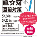 2022年5月12日 / 最終更新日時 : 2022年5月12日 arcedu 都島中通校BLOG 【都島中通校】直☆対・定期テスト直前対策(無料) 【直☆対・定期テスト直前対策(無料)】のお知らせです。 いよいよ第1回定期テストがやってきます!幸先の良いスタートを切るべく、直前対策(直対)、マイ☆スタに参加してしっかり勉強していきましょう。直対では、学校の提出物等を […]