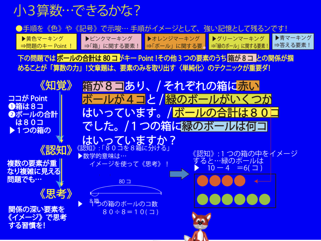 不得意な生徒全員に共通する特徴は「問題がわかっていない」です。 - 必要な情報とは、言葉で書かれた言語情報を、更に数学的情報に変換した情報のことです。