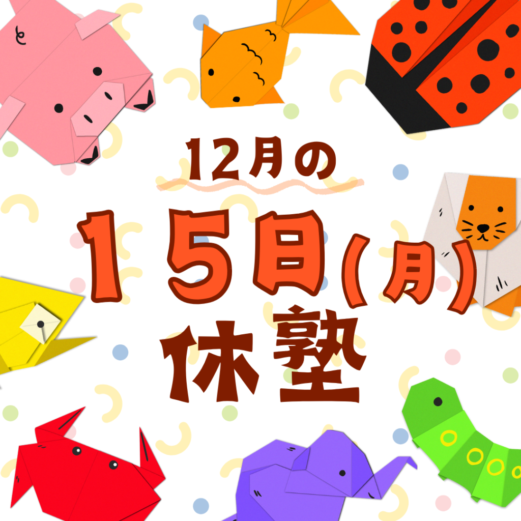 2025年12月4日 / 最終更新日時 : 2025年12月4日 arcedu 都島中通校BLOG 【12月休塾日のお知らせ】 12月の休塾日は15日(月)となっております。年末は30日、31日がお休みとなっております。