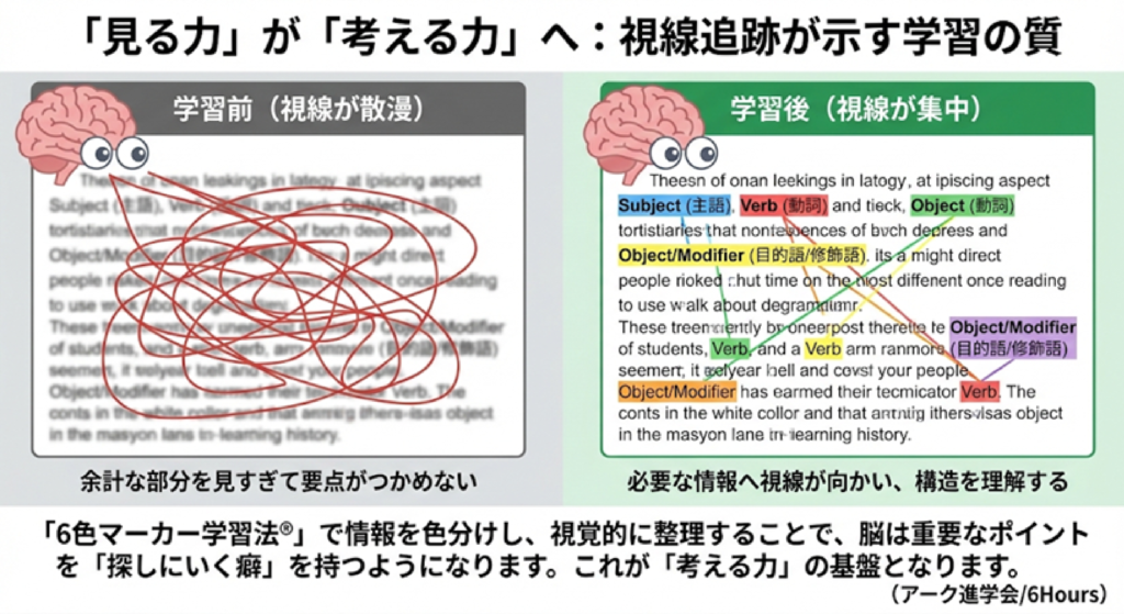たとえば、英文を読むときに重要なポイントを色分けすることで、解ける人の視線が“必要な情報”へ向かうのに対し、そうでない人は余計な部分を見すぎて要点がつかめていない、という違いが出るという研究結果(視線追跡)も報告されています。